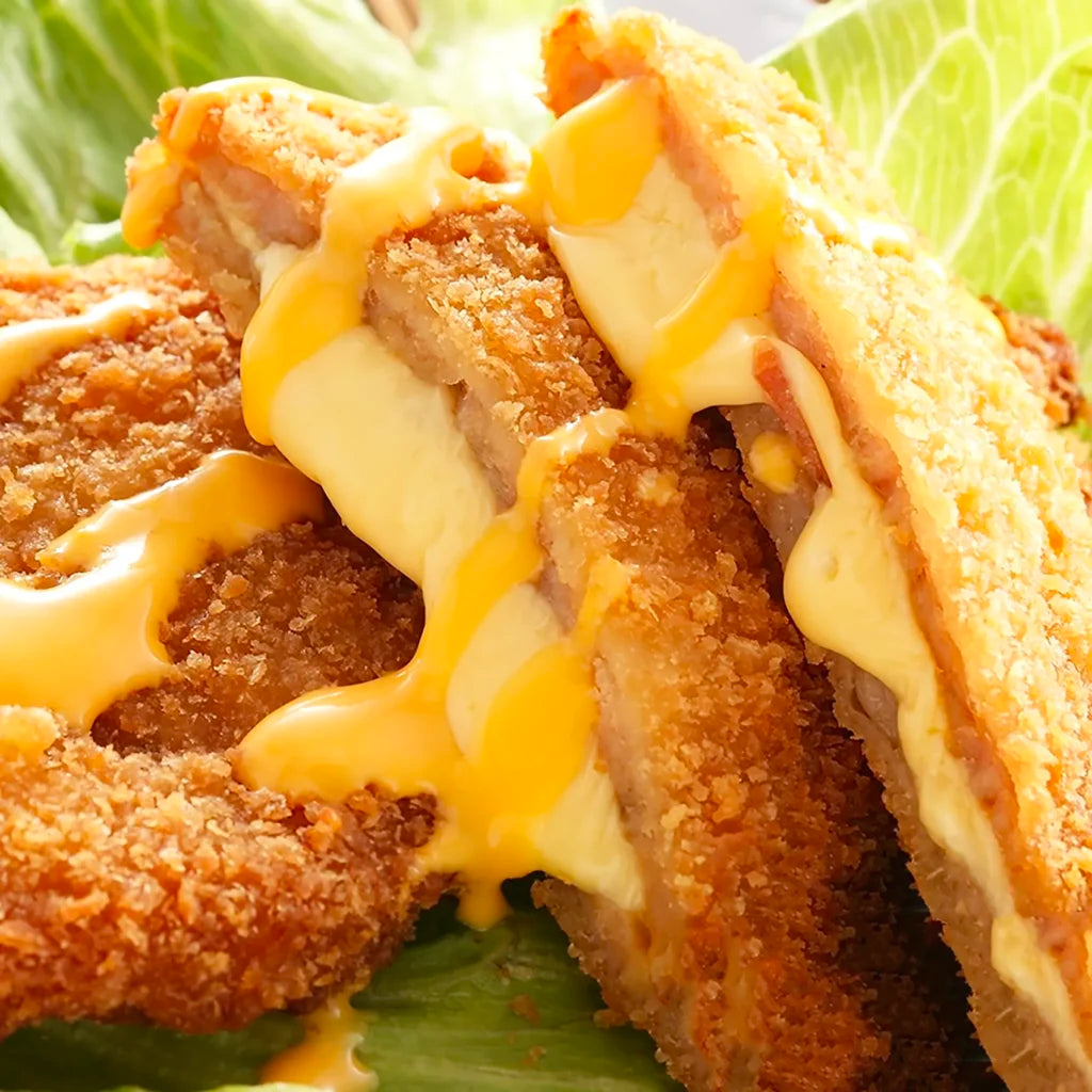 嚴選鮮嫩雞扒製成,外層包裹酥脆的麵包糠。芝士加熱後熔化味道更加濃郁,中間夾著的火腿令芝士雞扒口感更豐富。